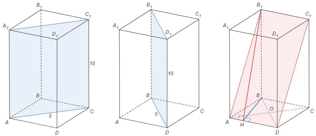 Стороны сечения - ребра оснований (B1C1=AD) и диагонали боковых граней (AB1=DC1). Диагонали ромба ABCD перпендикулярны и точкой пересечения O делятся пополам.