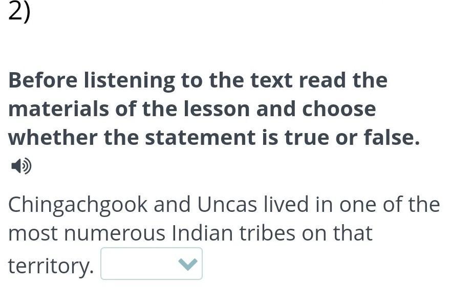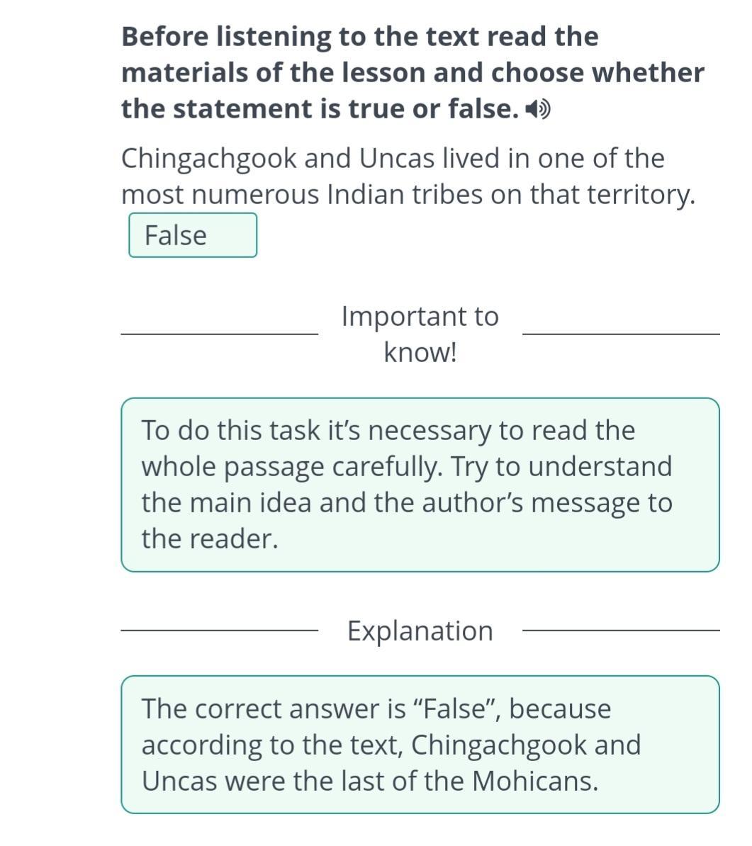Before listening to the text read the materials of the lesson and choose whether the statement is true or false. Chingachgook and Uncas lived in one of the most numerous Indian tribes on that territory.