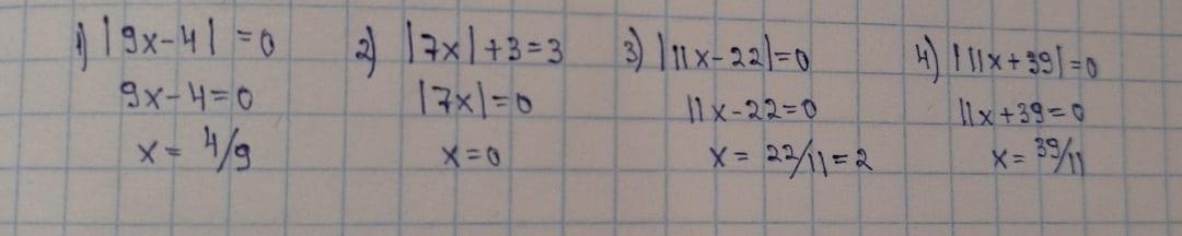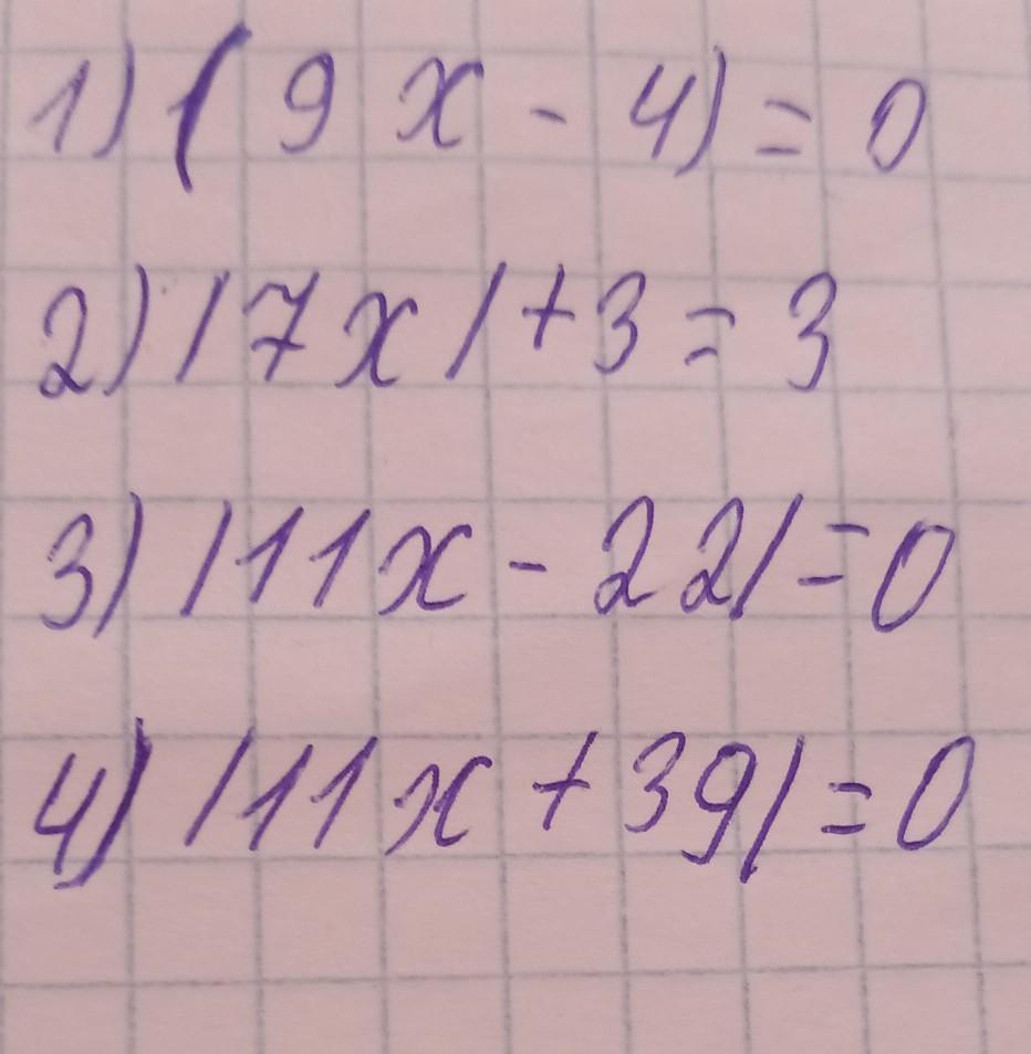 1) ( 9 x - 4) = 0 2)/7x/+3= 3 3) 111x-22/=0 4) /11x+391=0
