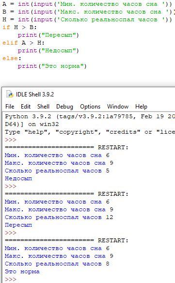 Судя по коду программа такая: вводится количество времени минимального и максимального сна и время реального. Надо вывести недоспал, переспал или норма