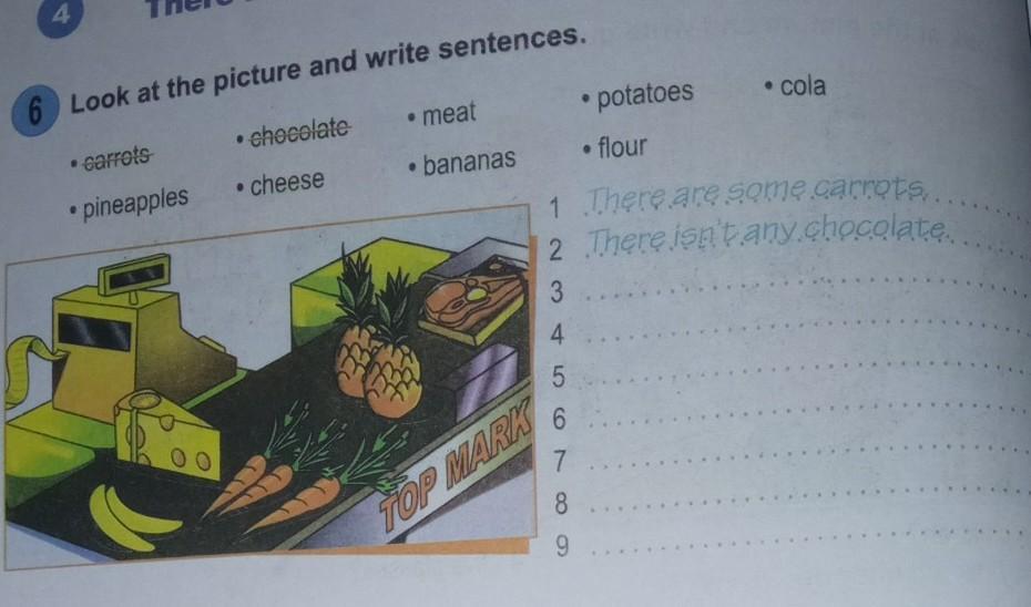 There is / There are - Some / Any Look at the picture and write sentences. carrots • meat • pineapples • bananas ● chocolate cheese · TOP MARK 23456 1 There are some carrots.... 2 There isn't any.chocolate. there 6 78 • potatoes • flour 8 9 • cola ****