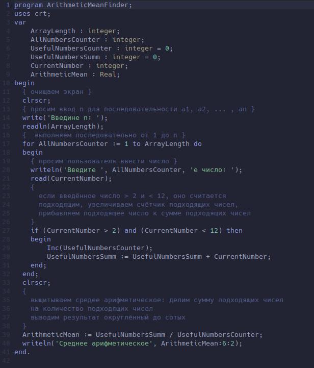 writeln('Среднее арифметическое', ArithmeticMean:6:2);