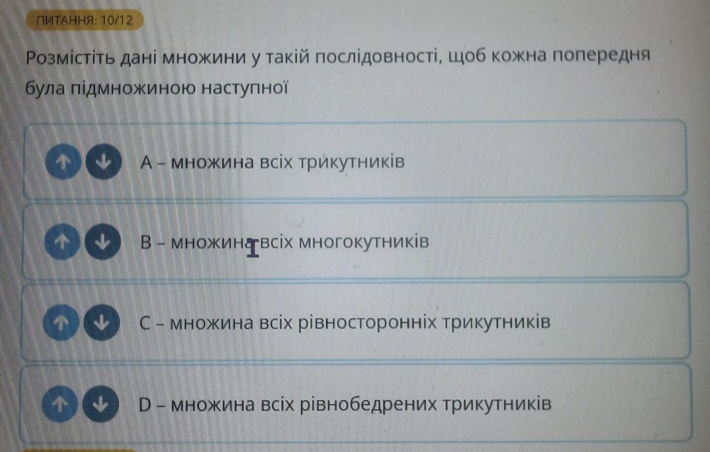 Відповідь - "Д" - множина всіх рівнобедрених трикутників
