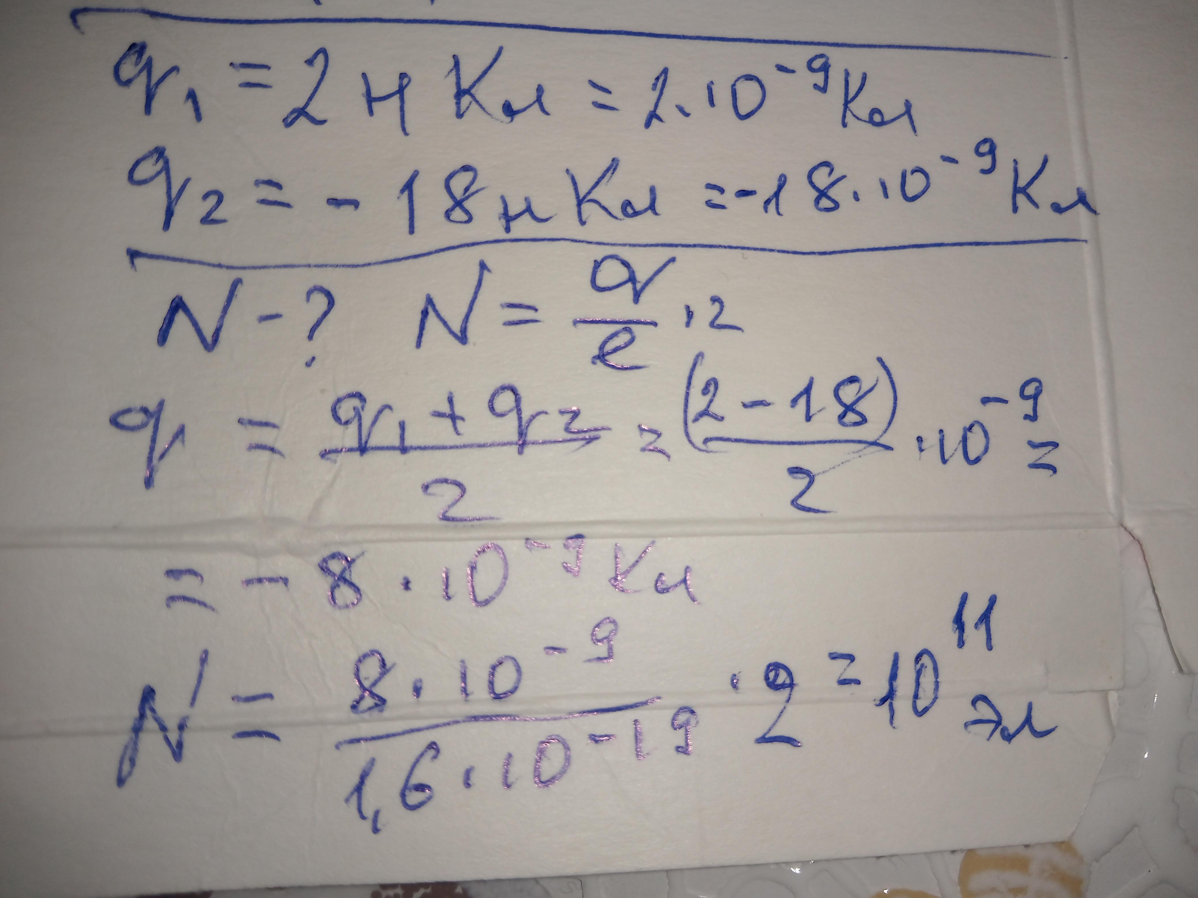 Дві заряджені кульки ,однакового розміру, спочатку з'єднали ,а потім роз'єднали. Визначте ,яку кількість електронів вони мають? Початкові заряди кульок дорівнюють +2 нКл та -18 нКл.