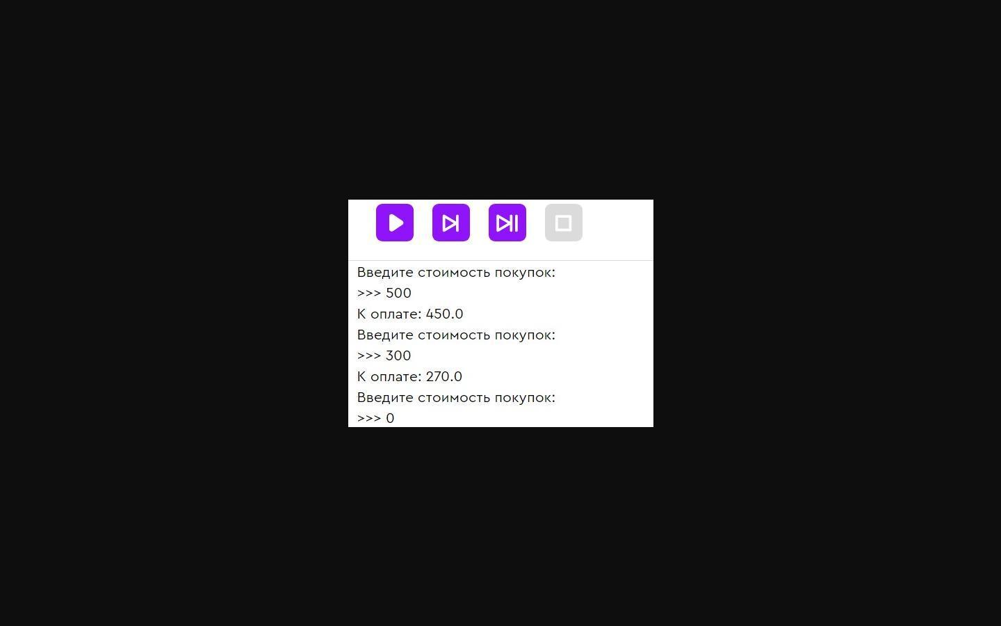 3. Повторять пункты 1 и 2, пока в качестве стоимости не будет введён 0. Тогда программа должна завершить работу.