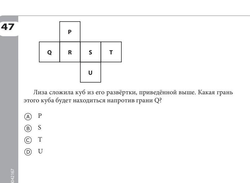 47 M042167 (А) P (в) Q S T (D U P R S U Лиза сложила куб из его развёртки, приведённой выше. Какая грань этого куба будет находиться напротив грани Q? T M01_15
