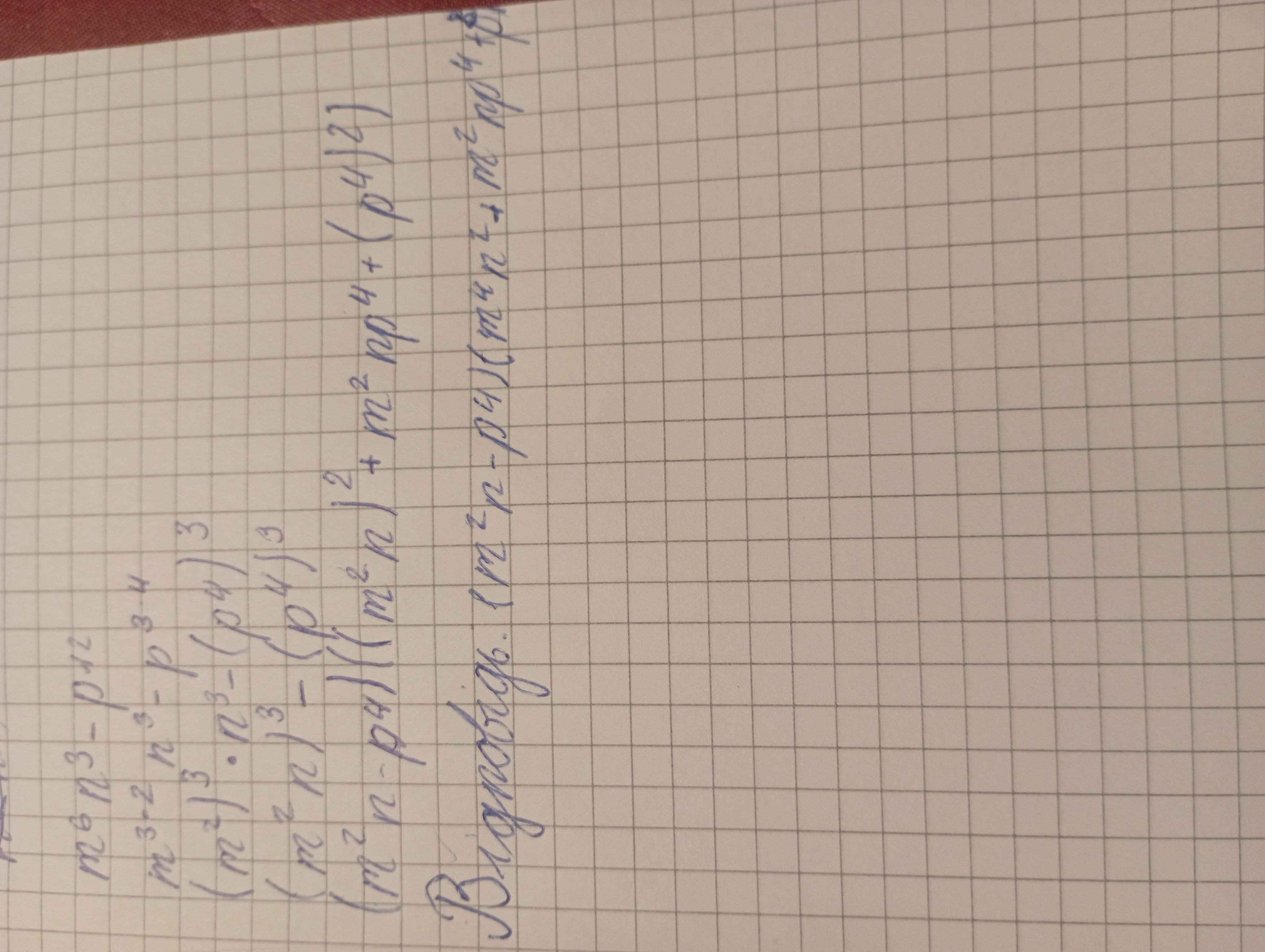 Ответ:(m²n-p⁴)(m⁴n²+m²np⁴-p⁸)