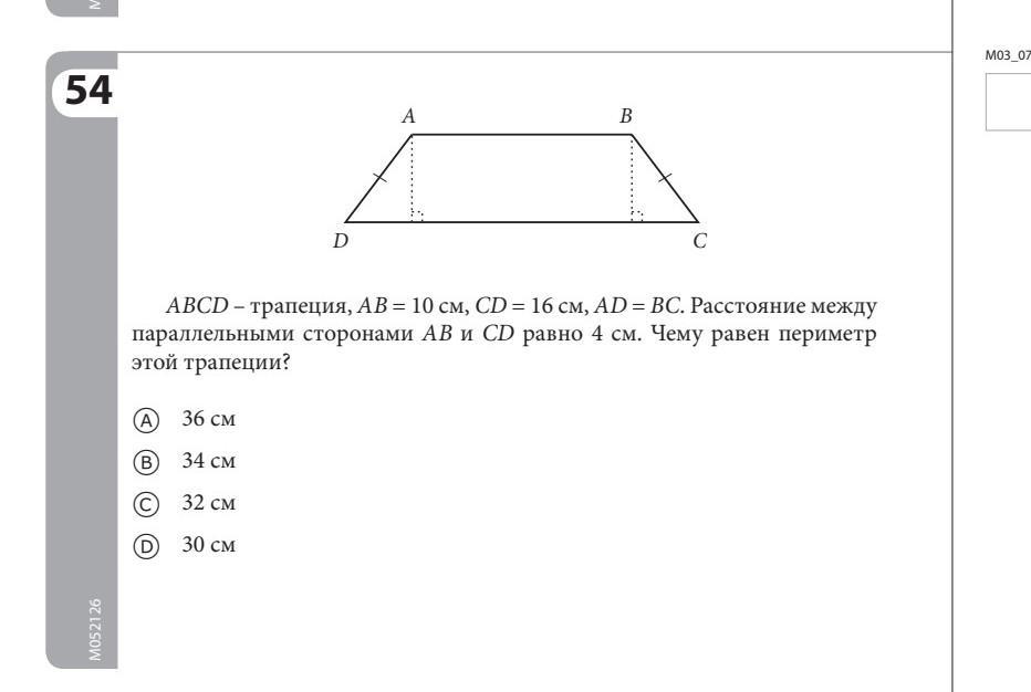 54 (А) 36 см (В 34 см 32 cm 30 см D D A B ABCD-трапеция, АВ = 10 см, CD = 16 см, AD = BC. Расстояние между параллельными сторонами АВ и CD равно 4 см. Чему равен периметр этой трапеции? C