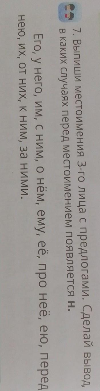 7. Выпиши местоимения 3-го лица с предлогами. Сделай вывод, в каких случаях перед местоимением появляется н. о нем Его, у него, им, с ним, о нём, ему, её, про неё, ею, перед нею, их, от них, к ним, за ними.