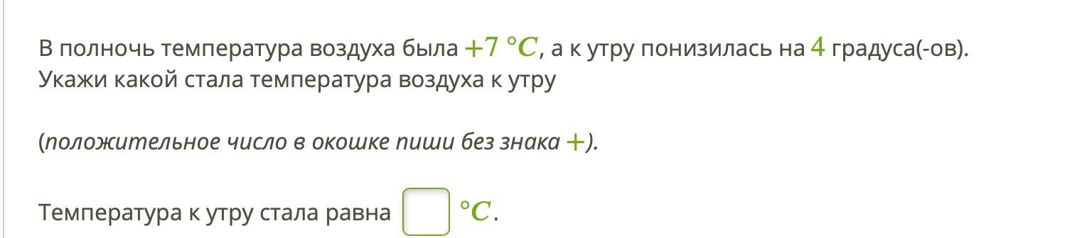 В полночь температура воздуха была +7 °С, а к утру понизилась на 4 градуса(-ов).