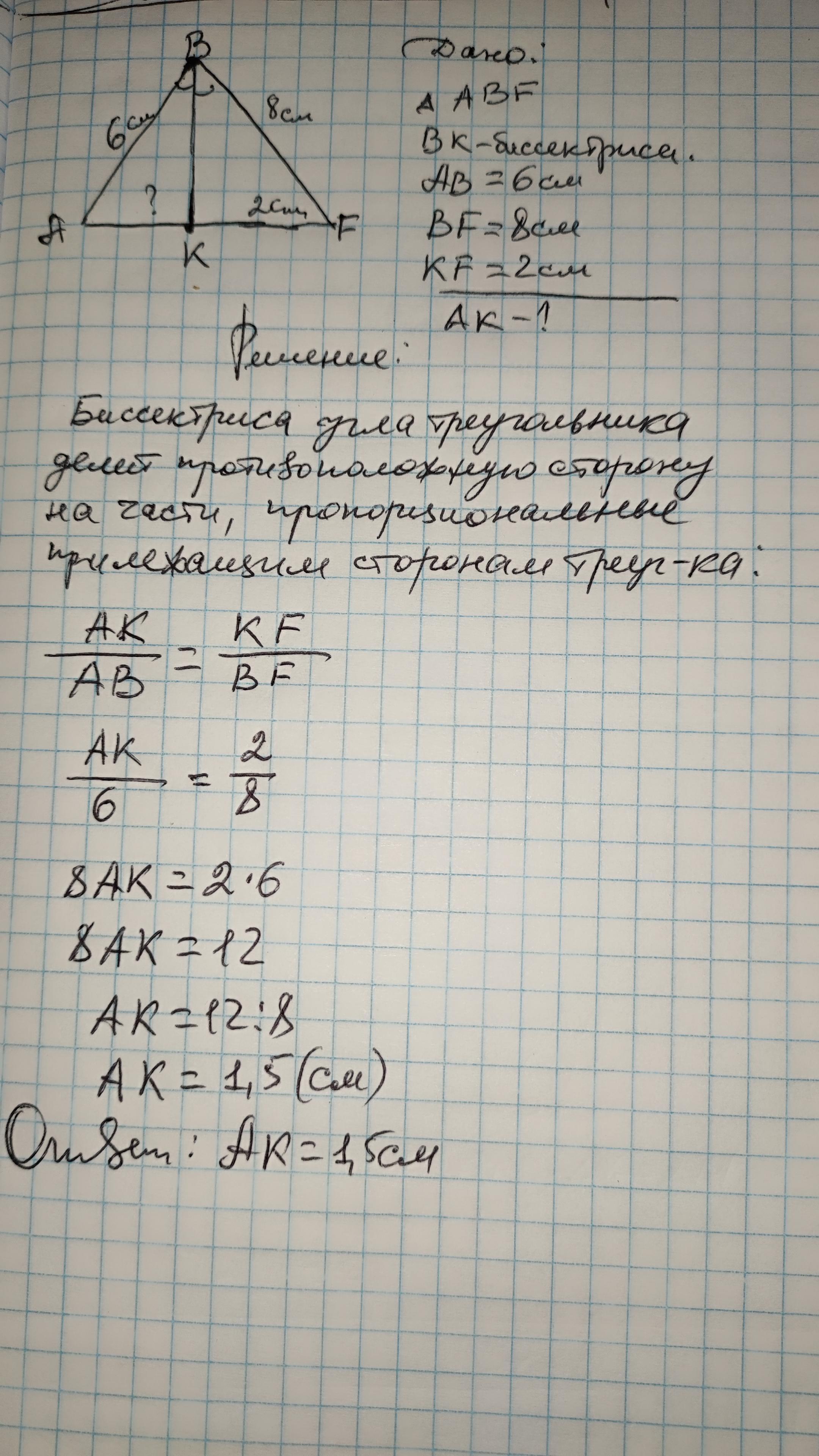 Бісектриса ВК трикутника ABF ділить сторону AF на відрізки АК і KF. Знайти довжину відрізка АК, якщо АВ=6 см, BF=8 см, FK=2 см.