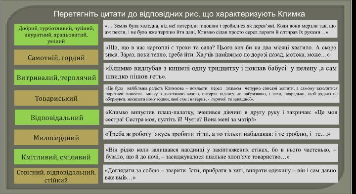Добрий, турботливий, чуйний, акуратний, працьовитий: Це була найбільша радість Климкова — покласти перед дядьком чепурно списані зошити....