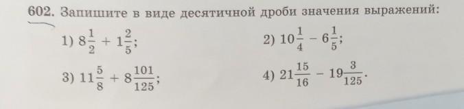 602. Запишите в виде десятичной дроби значения выражений: 1 2 1) 8 + 1²/; 2) 10- - 6: 3) 11/ +8 101 125 3 4) 2115 - 19,25 16 15