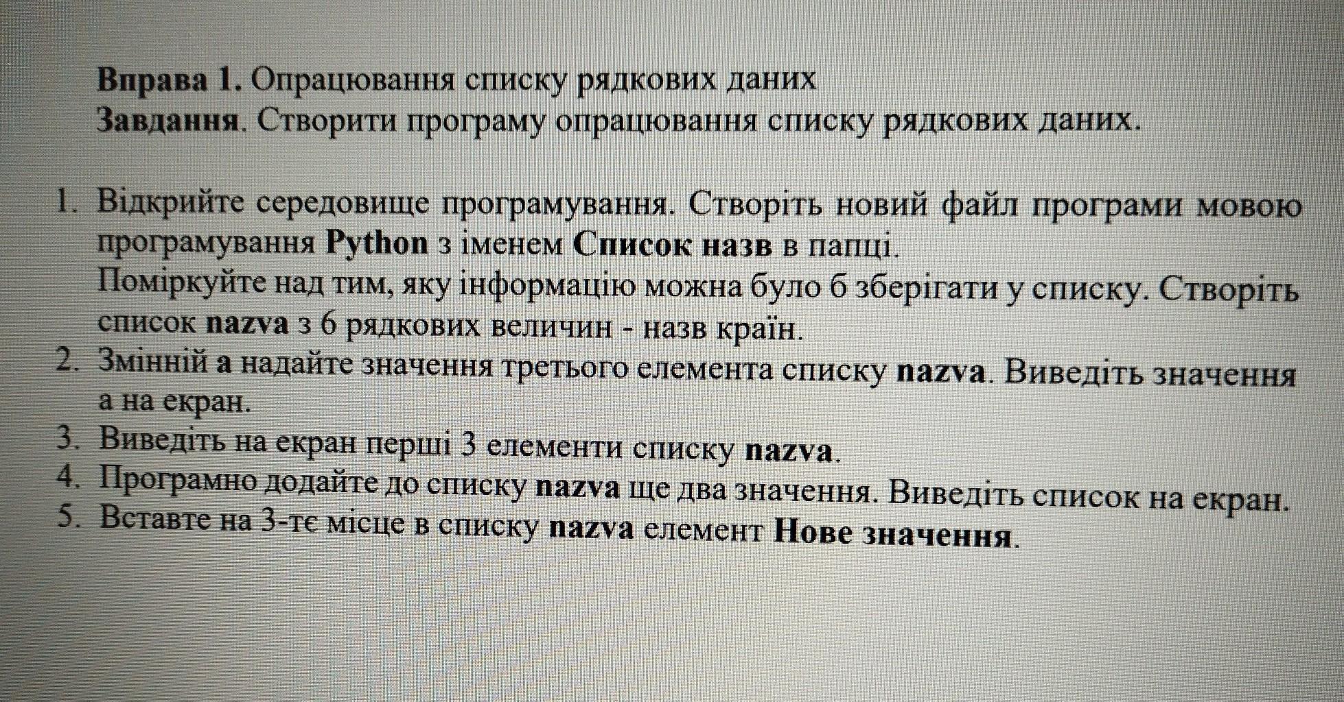 nazva = ['Україна', 'Франція', 'Італія', 'Японія', 'Польща', 'Китай']
