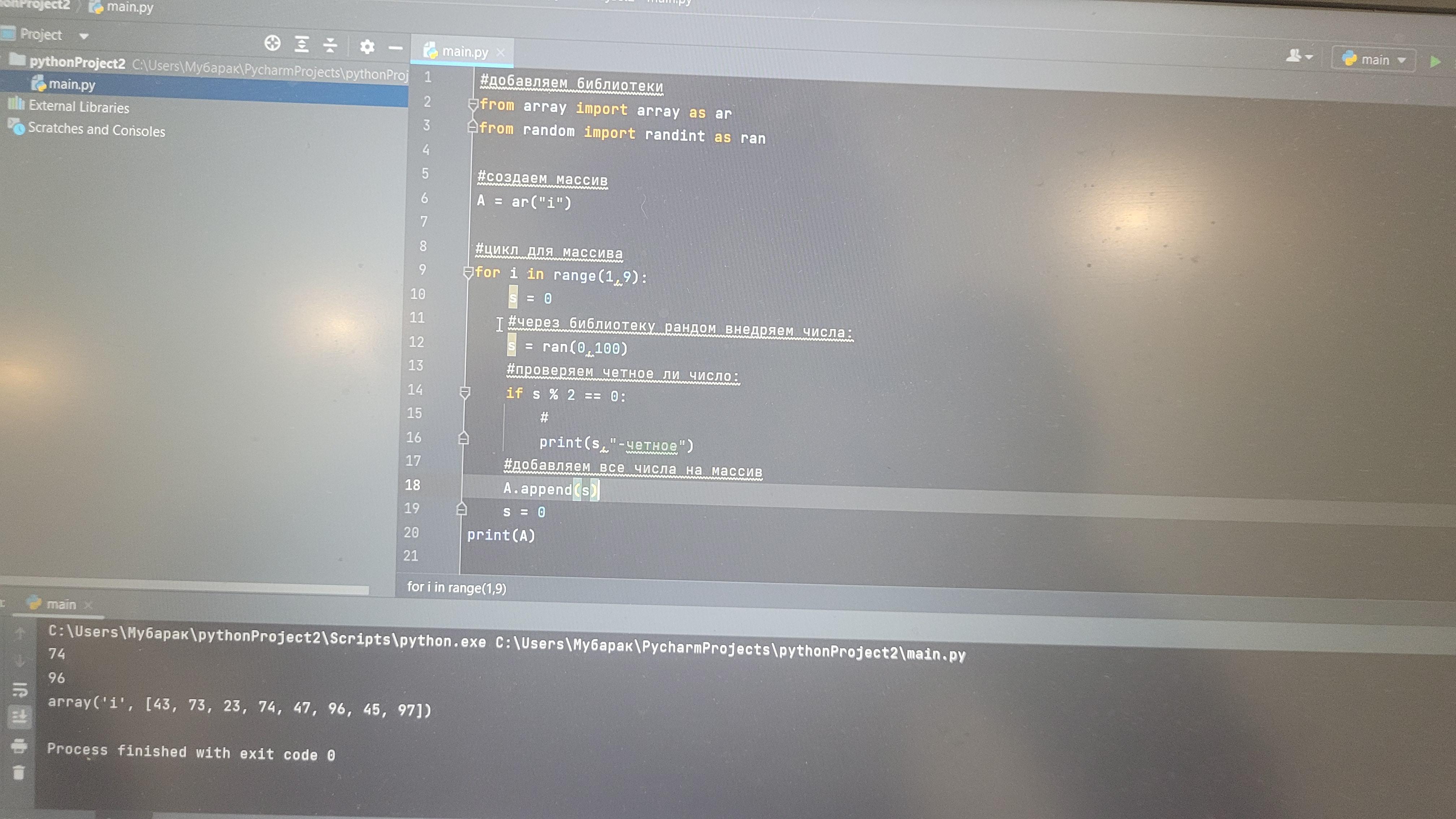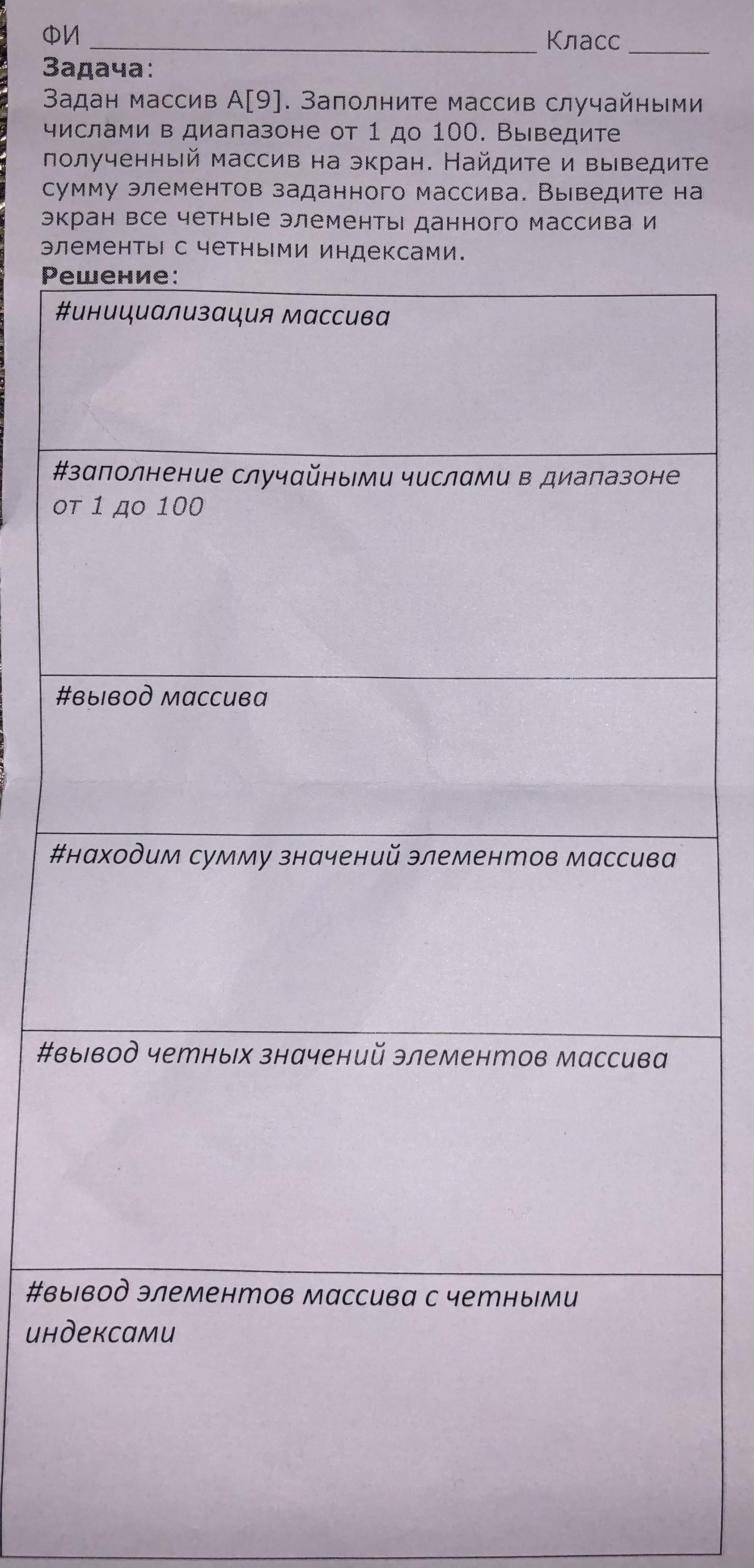 Задан массив A[9]. Заполните массив случайными числами в диапазоне от 1 до 100. Выведите полученный массив на экран. Найдите и выведите сумму элементов заданного массива. Выведите на экран все четные элементы данного массива и элементы с четными индексами.