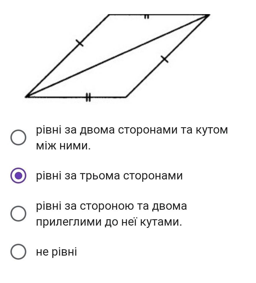 Ответ:Рівні за трьома сторонами, оскільки дві пари з них відмічені як рівні, а третя у обох трикутників спільна