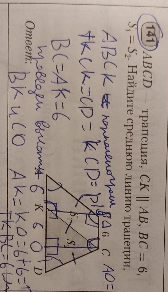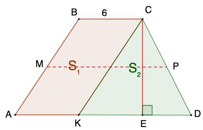 ABCD - трапеция, CK || AB, BC = 6, S₁ = S₂.