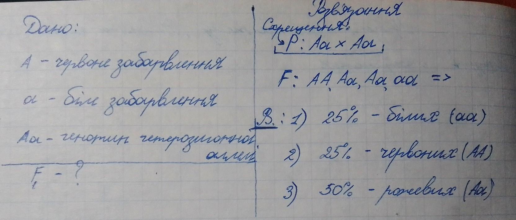БУДЬ ЛАСКААА ДОПОМОЖІТЬ ХТО НЕБУДЬ!!! ТЕРМІНОВО! Треба здати ЗАВТРА! Дам 50 балів! Біологія 9 клас. Розв'яжіть генетичну задачу. (Написати Дано та розв'язання). У рослини ген А визначає забарвлення оцвітини. Домінантний алель А забезпечує червоне забарвлення, а рецесивний алель а-біле. Домінування є неповним, і гетерозиготи мають рожеве забарвлення оцвітини квіток. Які генотипи й фенотипи будуть мати гібриди від схрещування двох гетерозиготних особин?
