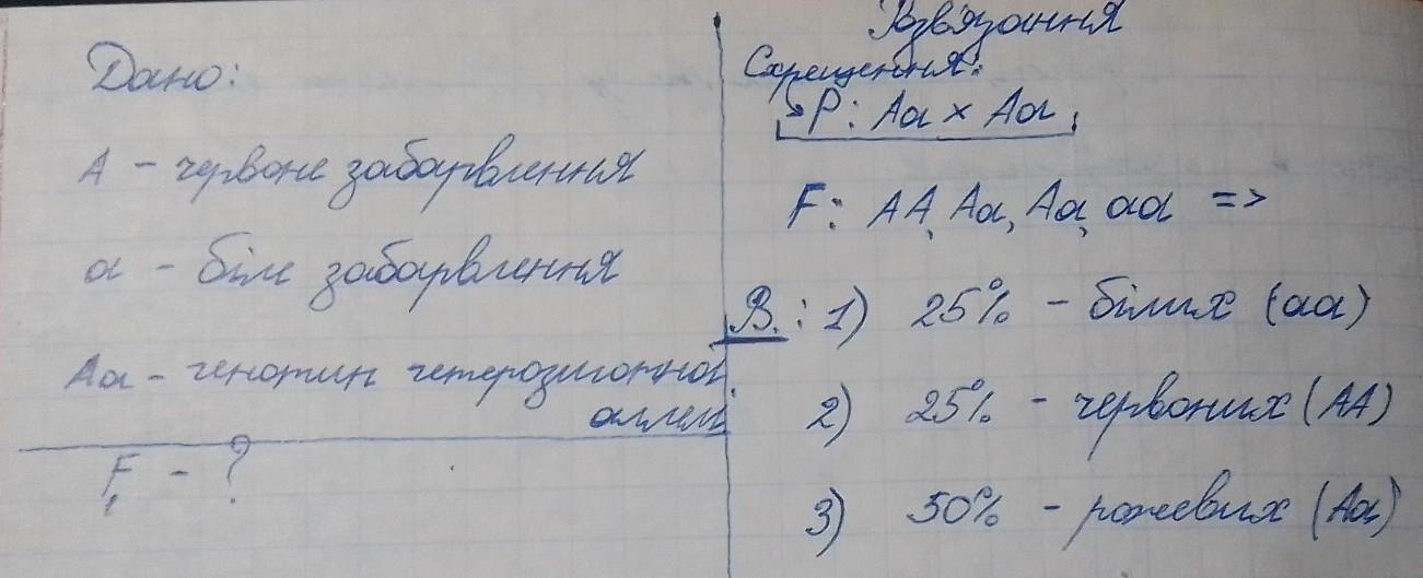 ПРОШУ БУДЬ ЛАСКААА ДОПОМОЖІТЬ ХТО НЕБУДЬ!!! ТЕРМІНОВО! Треба здати ЗАВТРА! Дам 50 балів! Біологія 9 клас. Розв'яжіть генетичну задачу. (Написати Дано та розв'язання). У рослини ген А визначає забарвлення оцвітини. Домінантний алель А забезпечує червоне забарвлення, а рецесивний алель а-біле. Домінування є неповним, і гетерозиготи мають рожеве забарвлення оцвітини квіток. Які генотипи й фенотипи будуть мати гібриди від схрещування двох гетерозиготних особин? Відповідь не по темі -бан.