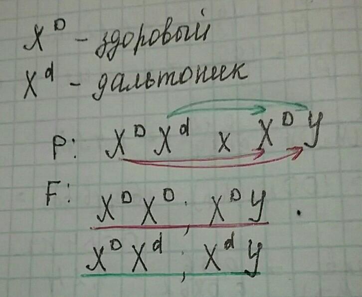 У супругов зрение нормальное, а единственный сын в семье плохо различает цвета — дальтоник. Это заболевание находится под контролем рецессивного гена, расположенного в X-хромосоме. Родители опасаются, что их следующий ребенок будет иметь такие же недостатки, и не знают, насколько велика опасность. Помогите им оценить вероятность этого события. Какова вероятность, что в этой семье может родиться здоровая девочка? Какова вероятность, что в этой семье может родиться здоровый мальчик? Может ли дочь этих родителей, выйдя замуж за здорового мужа, родить ребенка-дальтоника? Оцените такую возможность. Назовите словами генотип дочери.