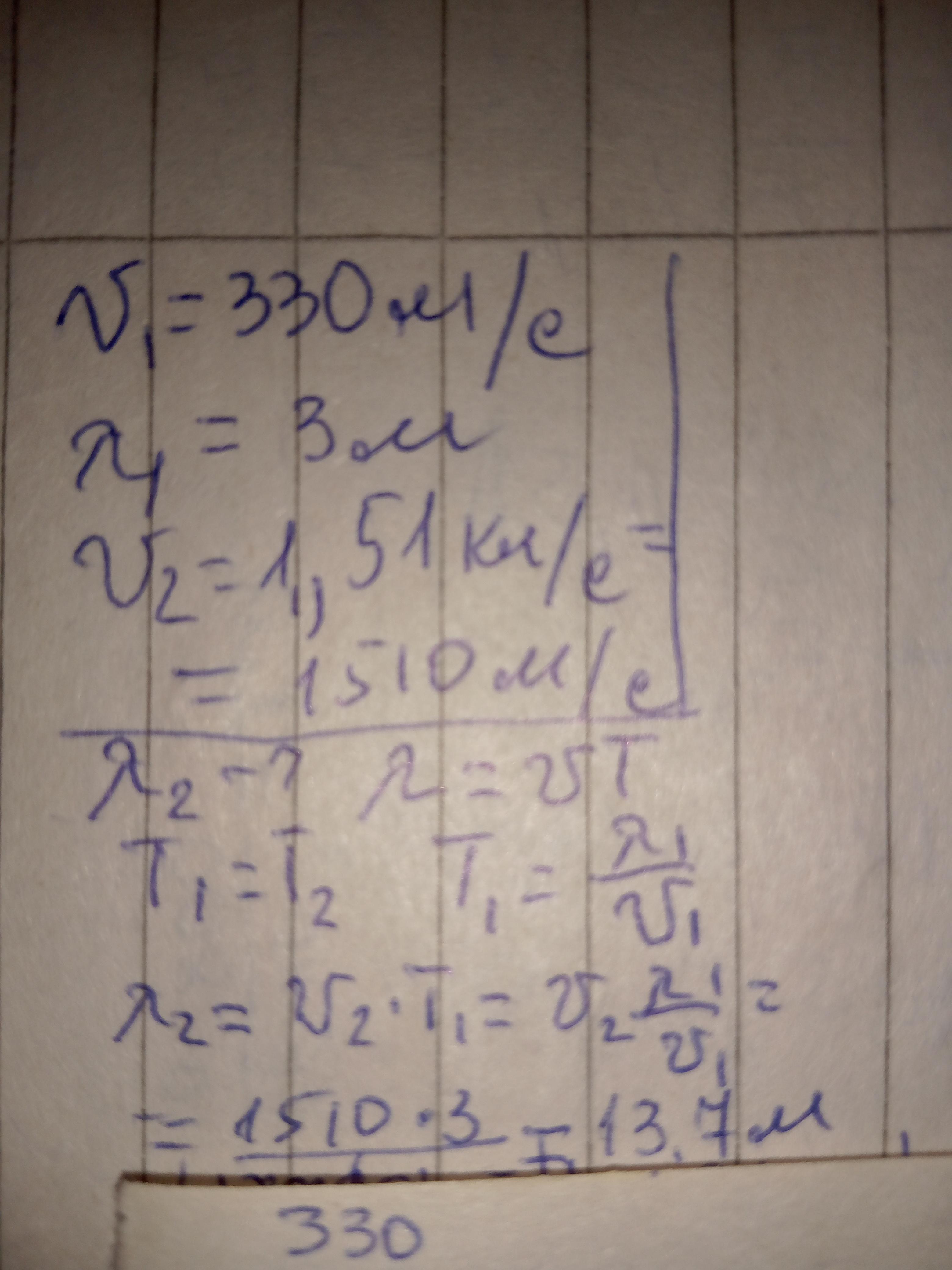 Звукова хвиля поширюється у повітрі зі швидкістю V1 -330 м/с. Має довжину 3 м, а під час поширення в воді зі швидкістю 1,51 км/с. Визначити довжину хвилі у воді.