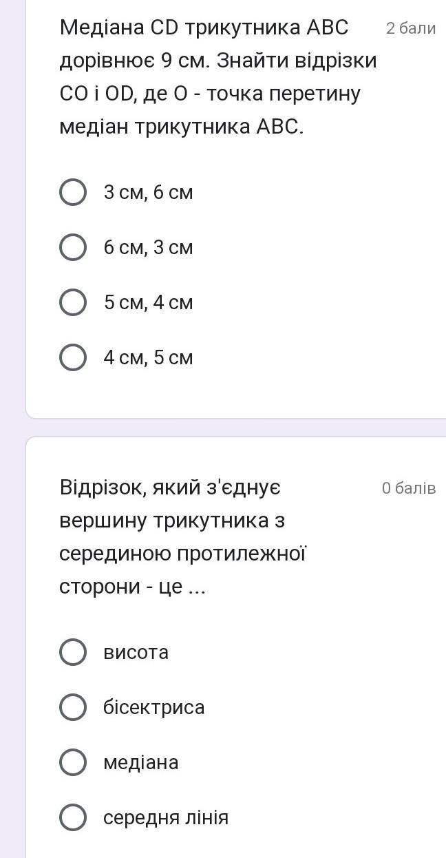 2.Відрізок, який з'єднує вершину трикутника з серединою протилежної сторони - це Медіана