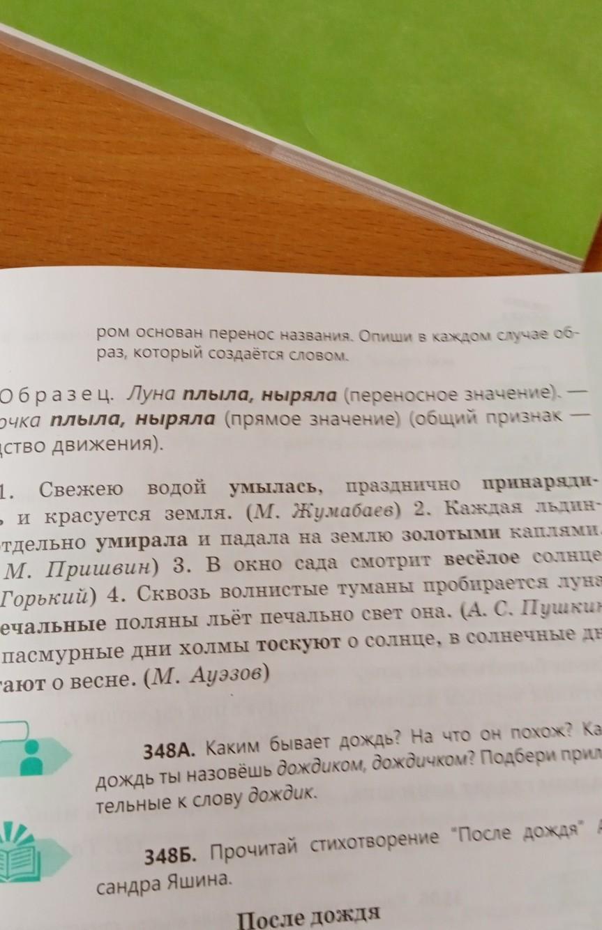 347Б. Поэты и писатели, играя словами, создают необыч- укажи их прямое значение. Назови общии признак, на кото- Прочитай предложения. Выпиши выделенные слова ные образы, оживляя явления природы.