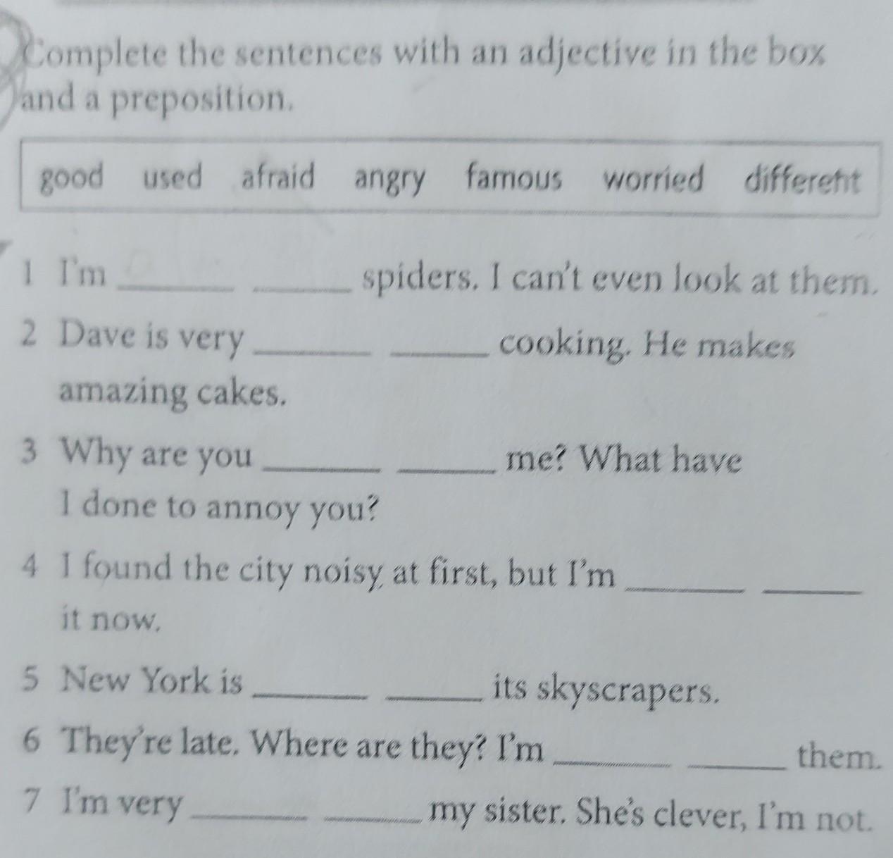 Complete the sentences with an adjective in the box and a preposition. good used afraid angry famous worried different 2 Dave is very_ amazing cakes. spiders. I can't even look at them. cooking. He makes 3 Why are you I done to annoy you? me? What have I found the city noisy at first, but I'm it now. its skyscrapers. New York is They're late. Where are they? I'm _______ I'm very them. my sister. She's clever, I'm not.