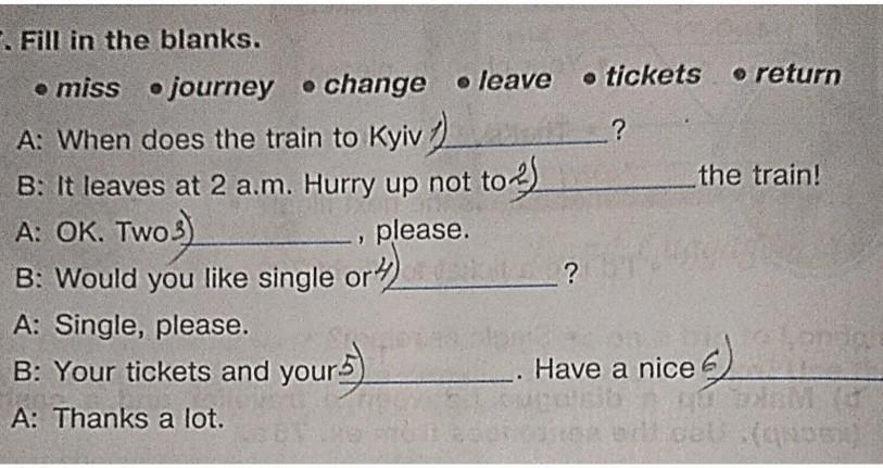 B: Your tickets and your change. Have a nice journey!