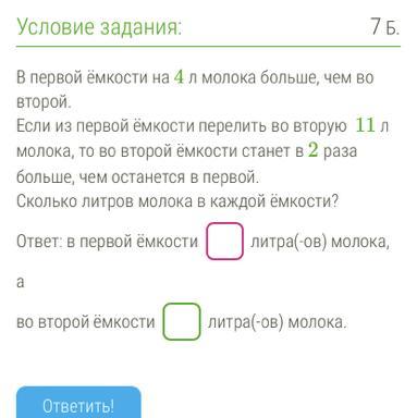 В первой ёмкости 19 литров молока, а во второй ёмкости 15 литров молока. Пожалуйста не благодорите)