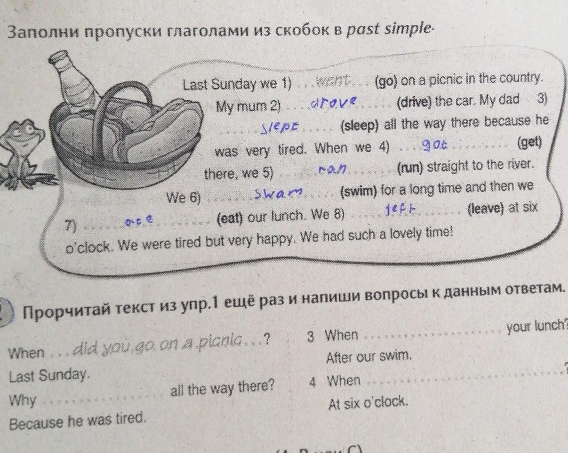 Прорчитай текст из упр. 1 ещё раз и напиши вопросы к данным ответам. 1 When...did you go on a picnic...? your lunch? Last Sunday. 2 Why Because he was tired. all the way there? 3 When After our swim. 4 When At six o'clock. ?
