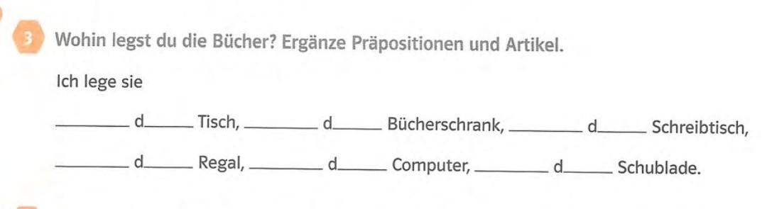 Ich lege sie auf den Tisch, in den Bücherschrank, auf den Schreibtisch, in das Regal, auf den Computer, in die Schublade.