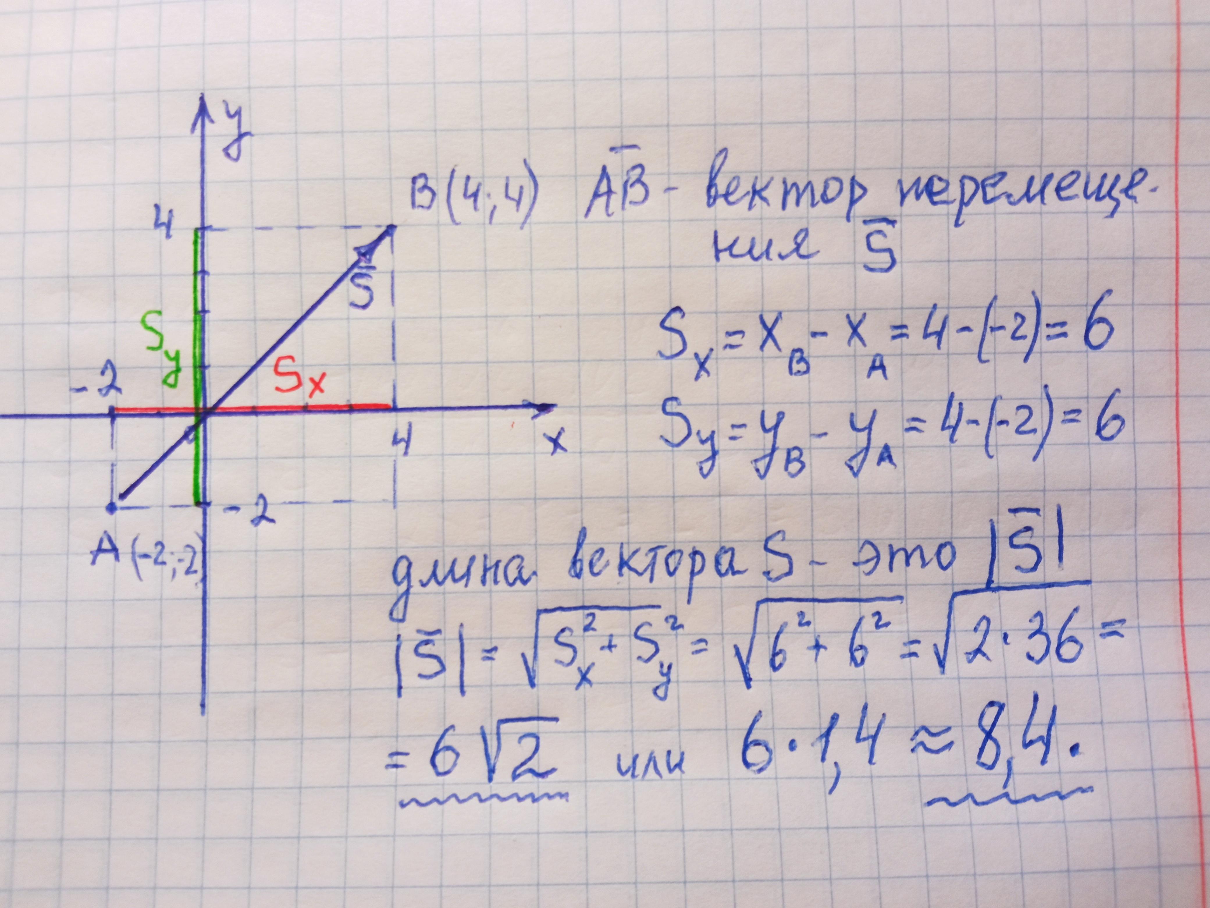 Тіло перемістилося з точки х координатами х1= -2 м , у1= - 2 м у точку з координатами х2 = 4 м, у2 = 4 м. Зробити креслення, побудувавши вектор переміщення. Визначити проекції цього вектора на координатні вісі та модуль вектора переміщення.