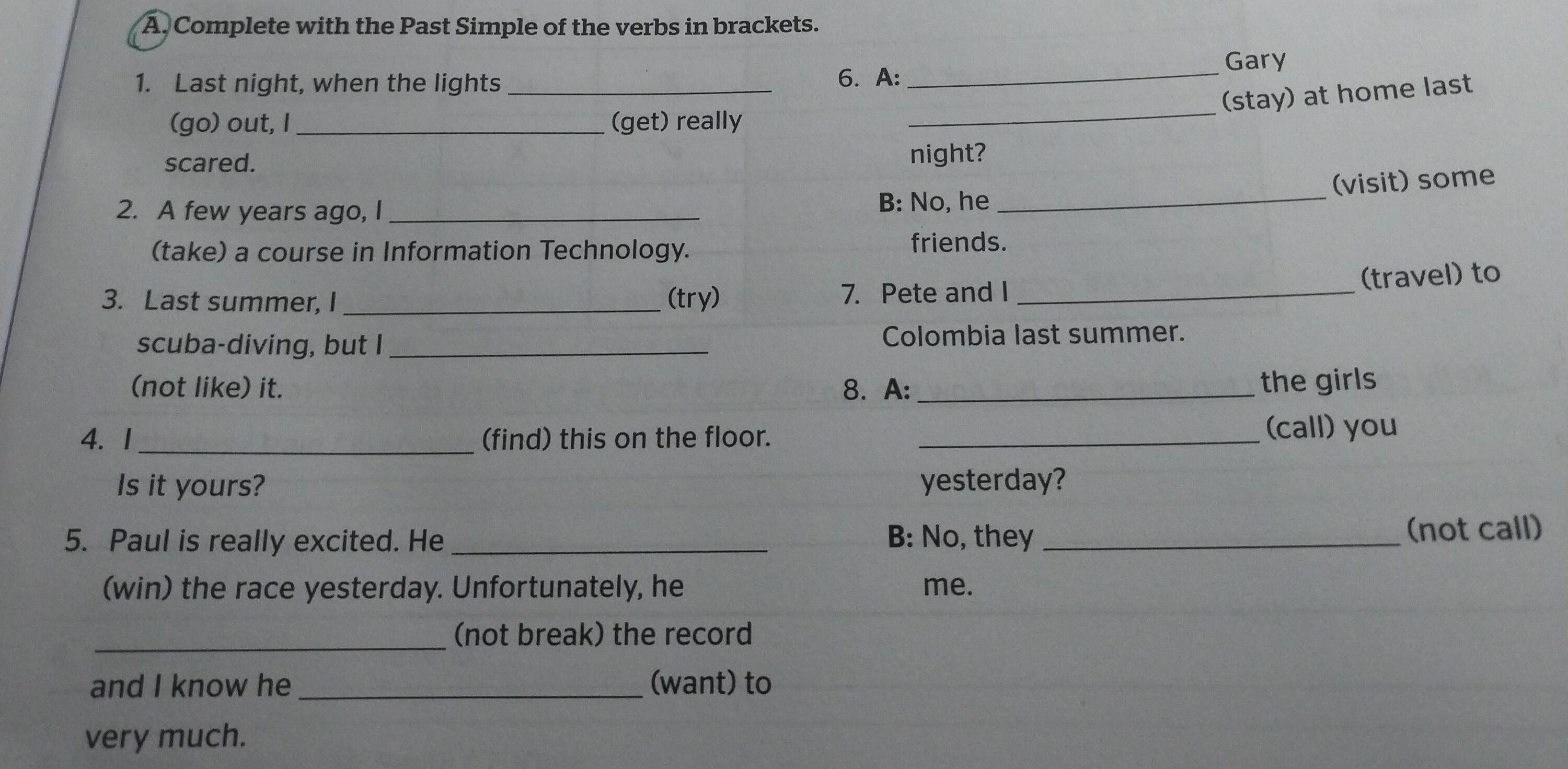 A. Complete with the Past Simple of the verbs in brackets. 1. Last night, when the lights (go) out, I scared. 2. A few years ago, I (take) a course in Information Technology. 3. Last summer, scuba-diving, but I (not like) it. 4. I Is it yours? (get) really and I know he very much. (try) (find) this on the floor. 5. Paul is really excited. He (win) the race yesterday. Unfortunately, he (not break) the record (want) to 6. A: night? B: No, he friends. 7. Pete and I Colombia last summer. 8. A: yesterday? B: No, they me. Gary (stay) at home last (visit) some (travel) to the girls (call) you (not call) срочно помогите даю 50