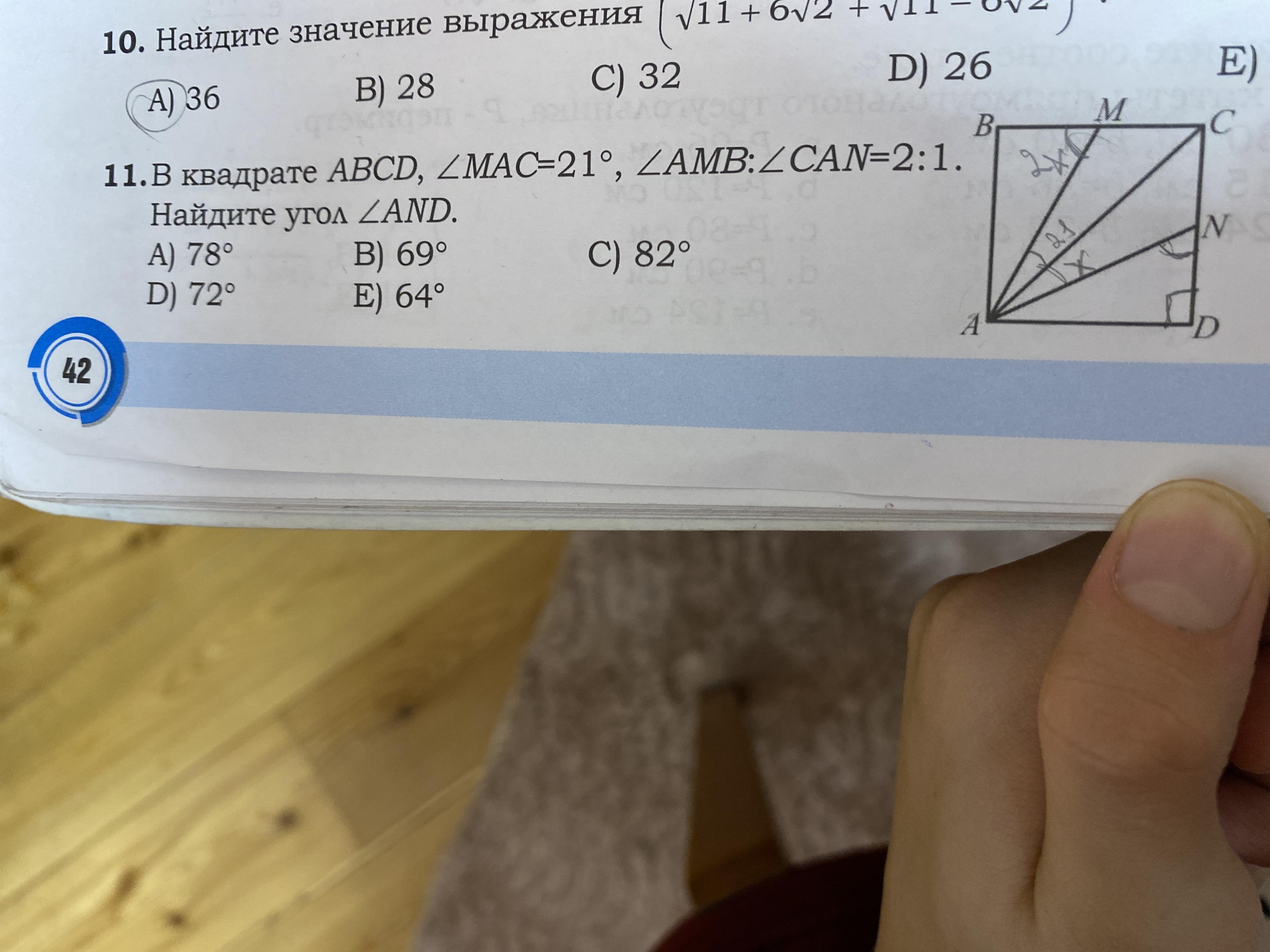По т о внешнем угле для ΔАМС имеем ∠BМА= 45+21, 2х=66 , х=33.