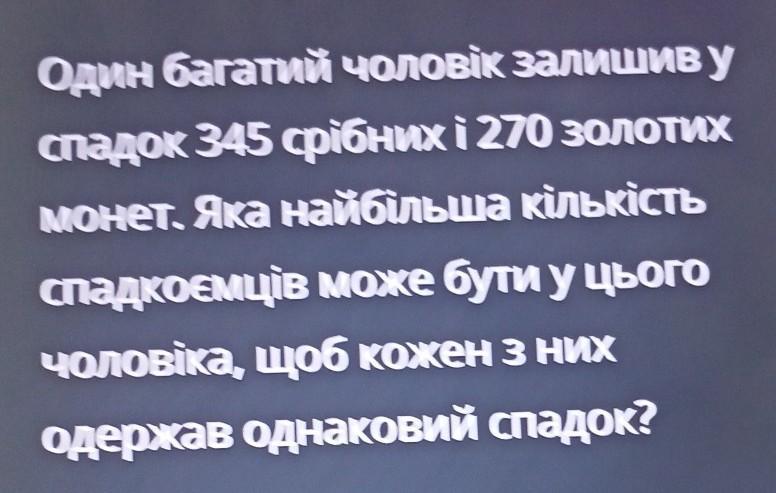 Один багатий чоловік залишив у спадок 345 срібних і 270 зоЛОТИХ монет. Яка найбільша кількість спадкоємців може бути у цього чоловіка, щоб кожен з них одержав однаковий спадок?