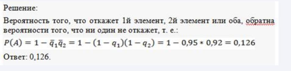 устройство состоит из двух независимо работающих элемента. вероятность отказа элементов соответственно равна 0,05 и 0,08. найди вероятность поломки устройства, если для этого достаточно чтобы отказал один элемент