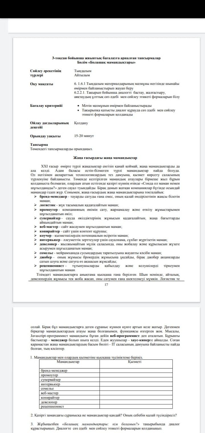 1ші оқушы: -сен болашақта қандай мамандық иесі болғын келеді?