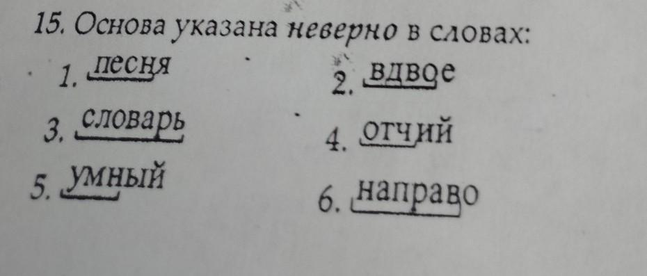 15. Основа указана . 1. песня 3. словарь 5. Умный неверно в словах: 2. вдвое 4. отчий 6. направо помогите пж