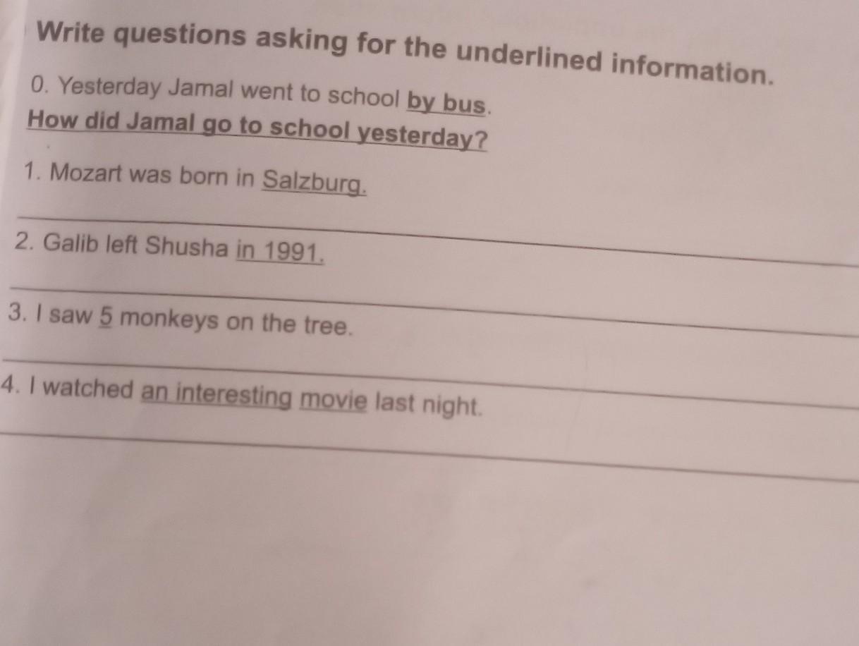 Write questions asking for the underlined information. 0. Yesterday Jamal went to school by bus. How did Jamal go to school yesterday? 1. Mozart was born in Salzburg. 2. Galib left Shusha in 1991. 3. I saw 5 monkeys on the tree. 4. I watched an interesting movie last night.