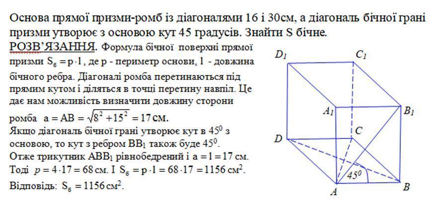 Основа прямої призми-ромб із діагоналями 16 і 30см, а діагональ бічної грані призми утворює з основою кут 45 градусів. Знайти S бічне