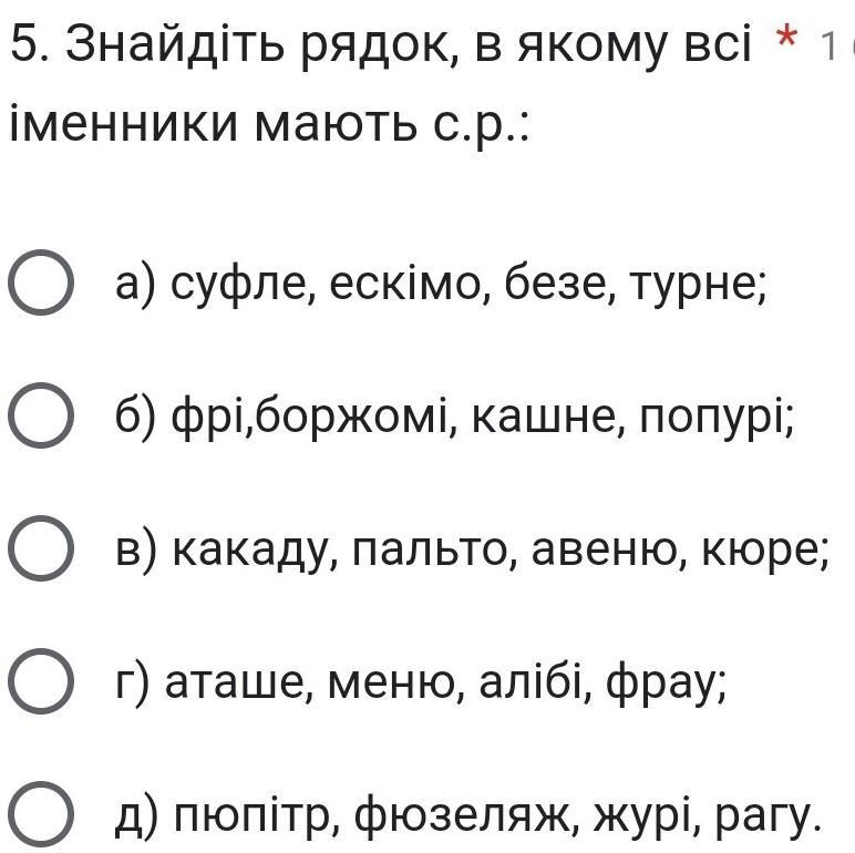 5. Знайдіть рядок, в якому всі * іменники мають с.р.: а) суфле, ескімо, безе, турне; О б) фрі,боржомі, кашне, попурі; О в) какаду, пальто, авеню, кюре; О г) аташе, меню, алібі, фрау; о д) пюпітр, фюзеляж, журі, рагу.