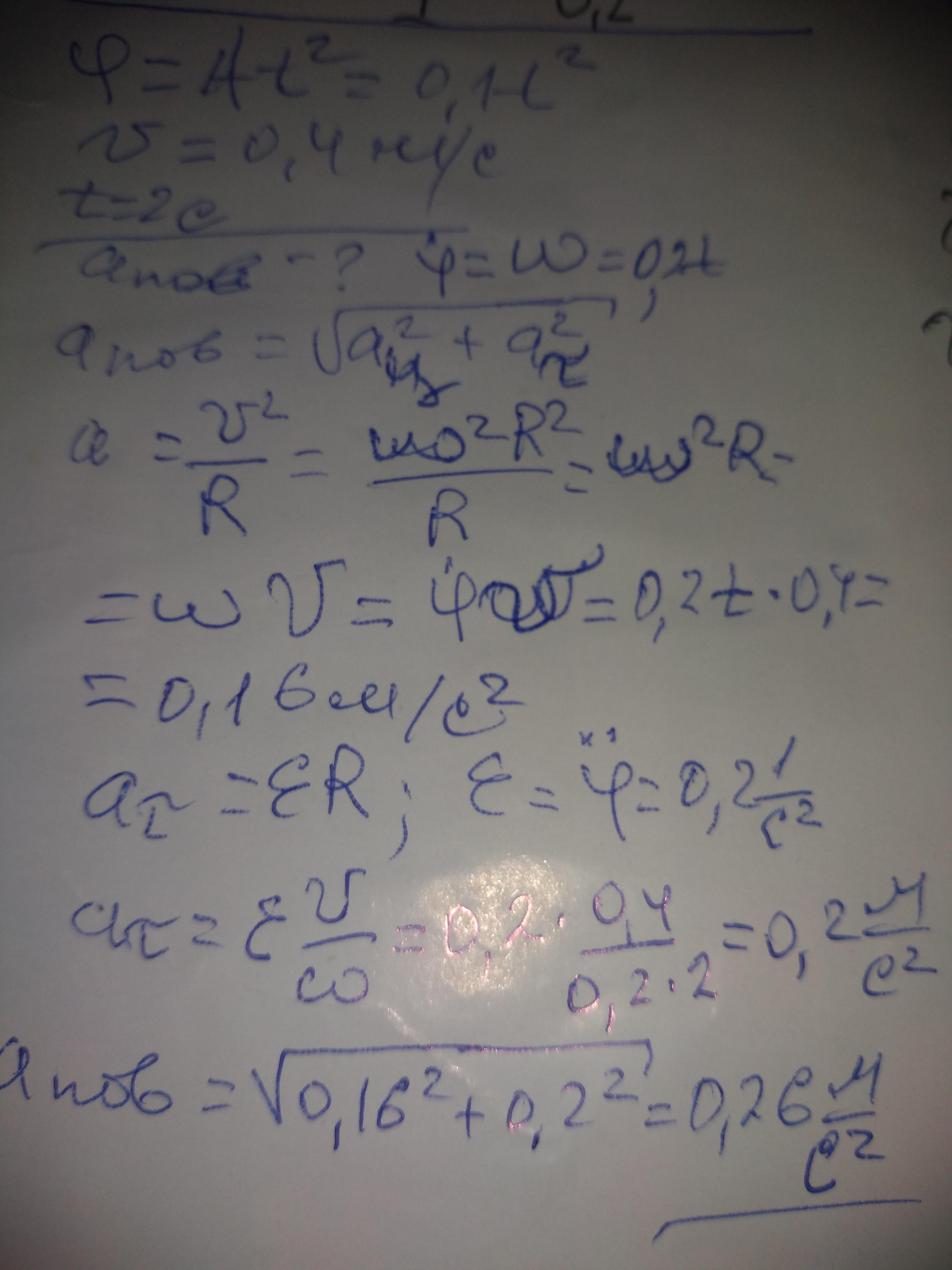 (А = 0,1 рад/с2). Визначити повне прискорення а точки на ободі диска наприкінці другої секунди після початку руху, якщо лінійна швидкість цієї точки в цей момент v = 0,4 м/с.