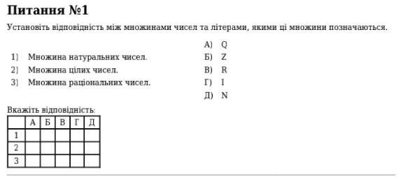 Питання №1 Установіть відповiднiсть мiж множинами чисел та літерами, якими ці множини позначаються. A) Q Б) Z B) R 1) Множина натуральних чисел. 2) Множина цілих чисел. 3) Множина раціональних чисел. Вкажіть відповідність: А Б В Г Д 1 2 3 Г) 1 Д) N