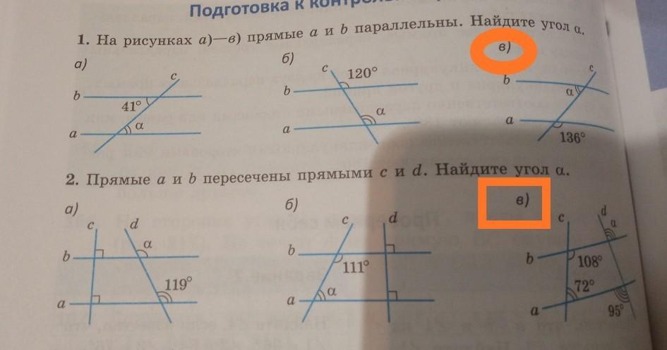 в)Прямые параллельны,т к односторонние углы в сумме равны 180 градусов