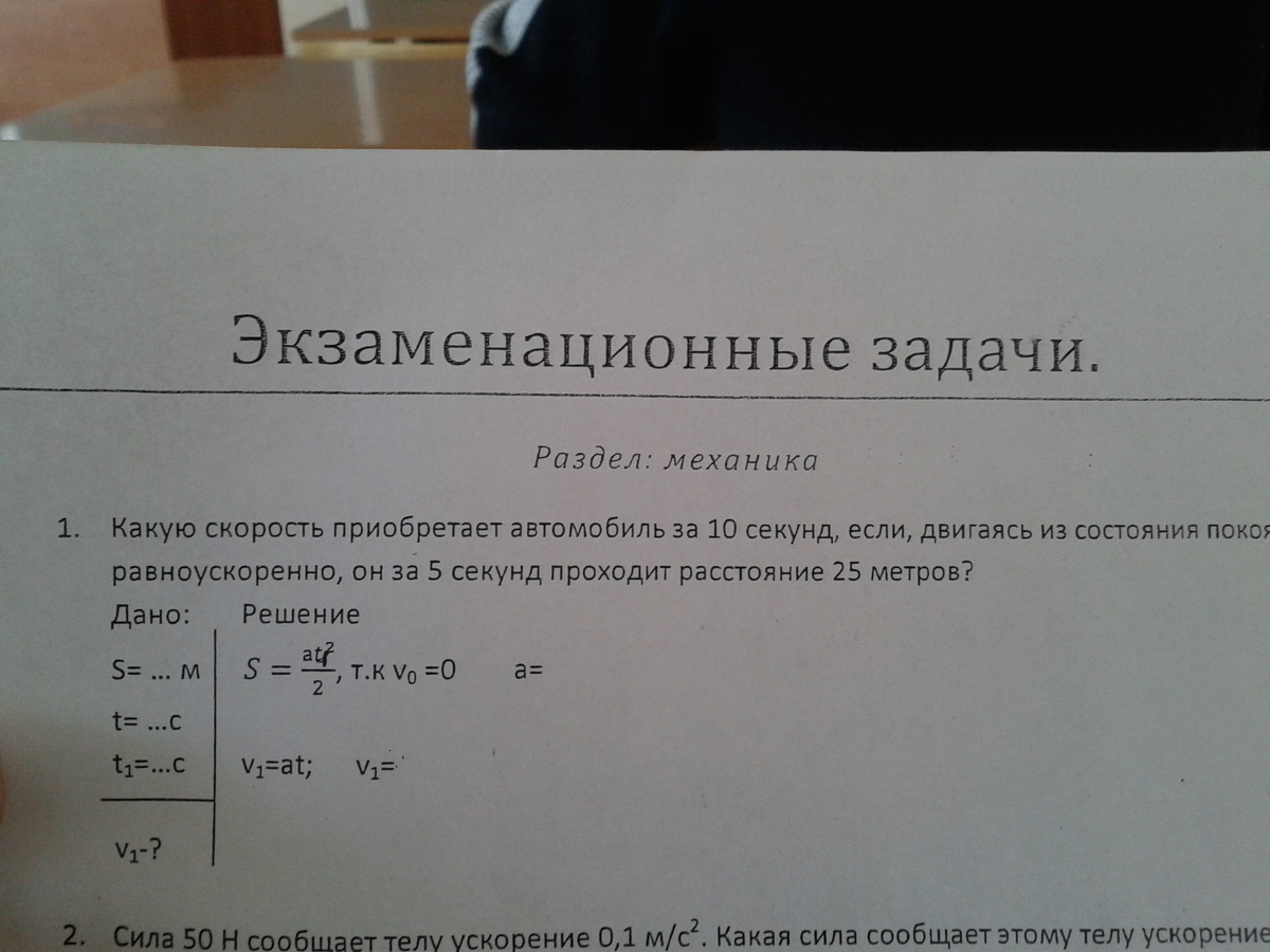 какую скорость приобретает автомобиль за 10 секунд, если, двигаясь из состояния покоя равноускоренно, он за 5 секунд проходит расстояние 25 метров?