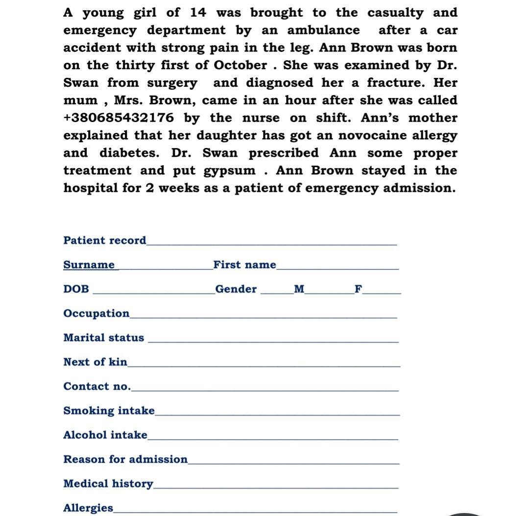 Patient record: A healthy 14-year-old female presented at the emergency department after a car accident with ambulance while injured severely after a car accident.