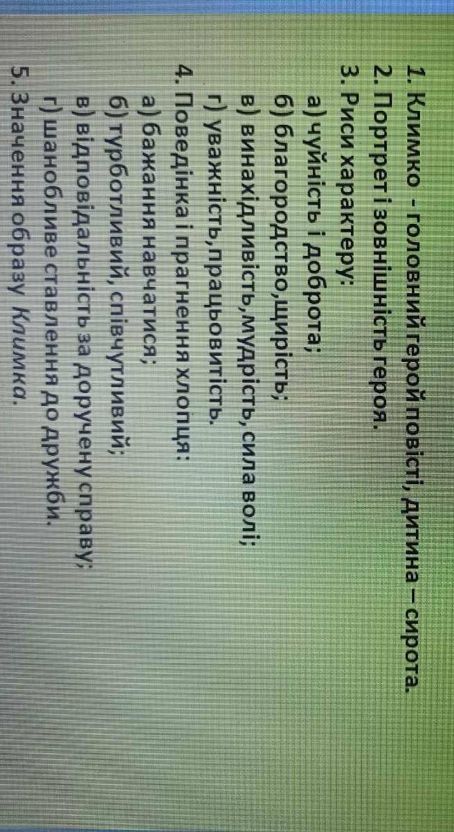 Зовнішність Климка: «Климко йшов босий, у куцих штанчатах, старій матросці, що була колись голубою, а тепер стала сіра, та ще й в дядьковій Кириловій діжурці. Тій діжурці, як казав дядько, було «сто літ», і не рвалася вона лише тому, що зашкарубла від давньої мазути»