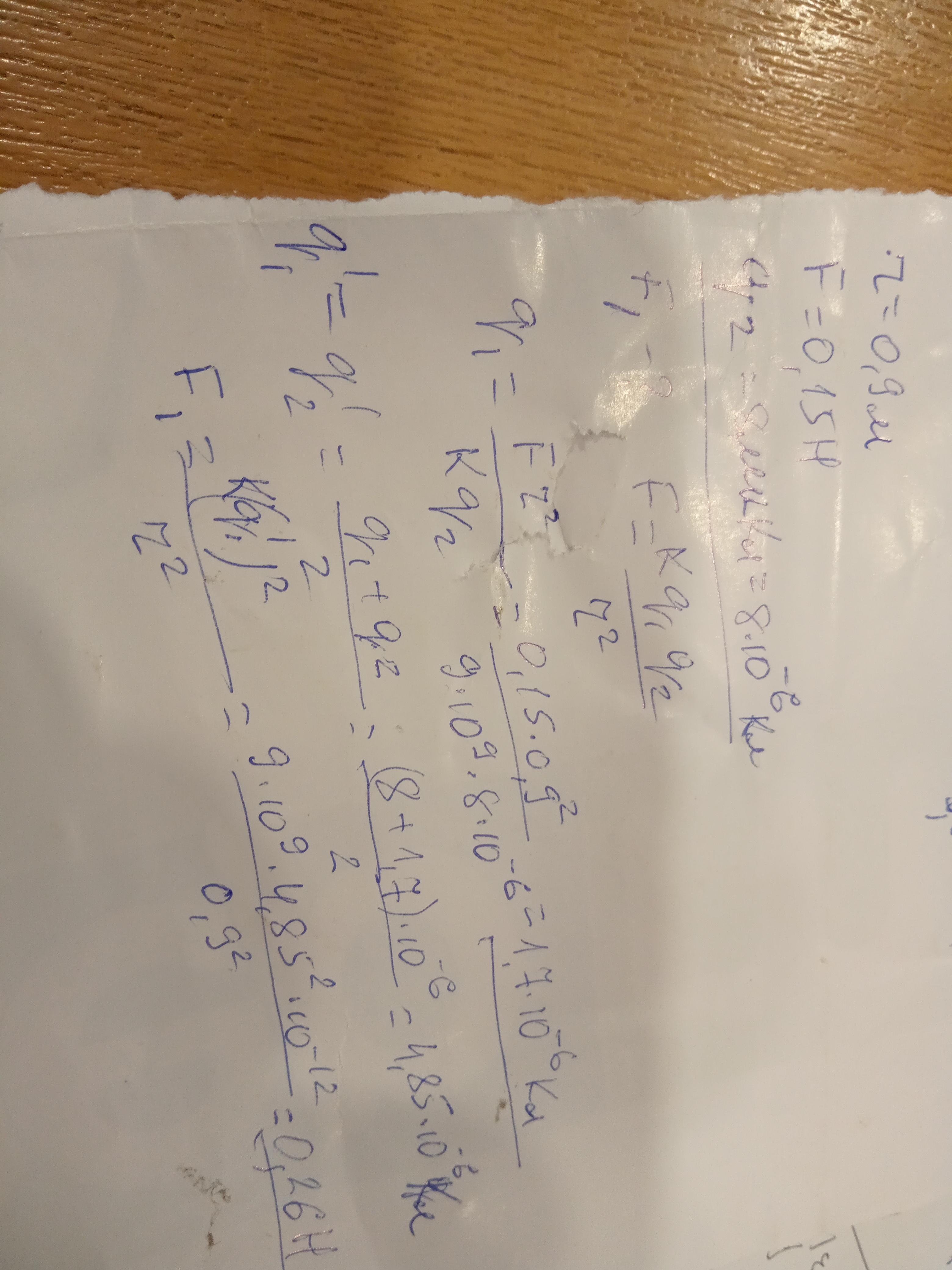 8Дві однакові однойменно заряджені кульки, розташовані на відстані 0,9 м одна від одної, взаємодіють із силою 0,15 Н. Заряд другої кульки дорівнює +8 мкКл. Визначте заряд першої кульки. Обчисліть, якою буде сила електростатичної взаємодії кульок після того, як вони торкнуться одна одної й знову розійдуться на таку саму відстань.