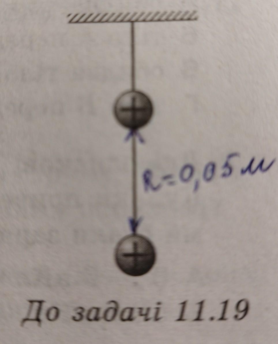 На шовковій нитці висять дві позитивно заряджені кульки масами 40 мг кожна (див. рисунок). Заряди кульок дорівнюють 10 нКл, відстань між ними становить 5 см. Чому дорівнює сила натягу нит- ки між кульками? Як зміниться відповідь у випад- ку, коли заряд однієї з кульок дорівнює -10 нКл?